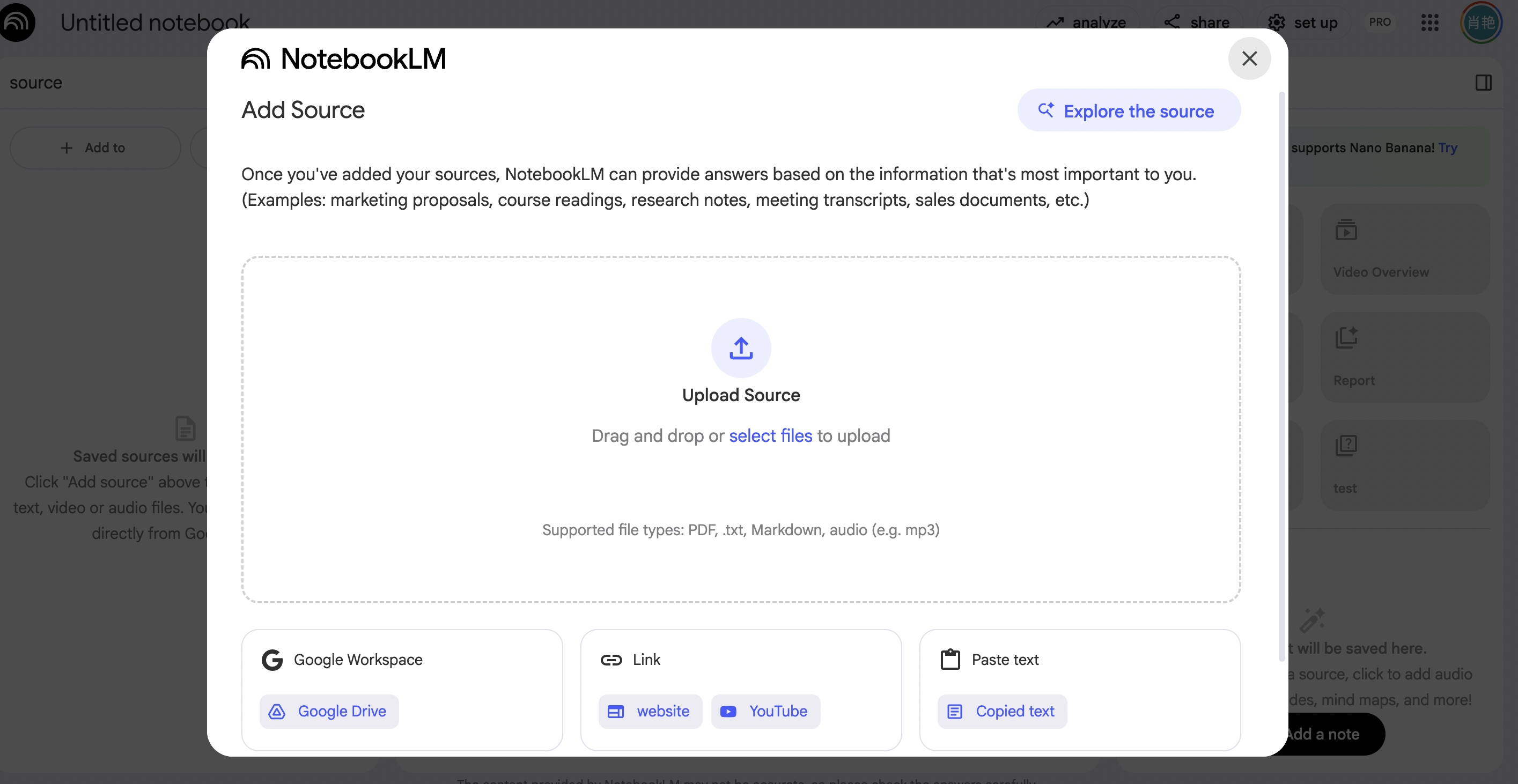 On the left is your content information source area, where you can upload and add data. If you don’t have any data uploaded, you can also click Explore, enter a topic, and the AI will directly search the Internet for relevant content and add it to the topic. The AI will integrate the multiple content you uploaded across data for analysis and matching.