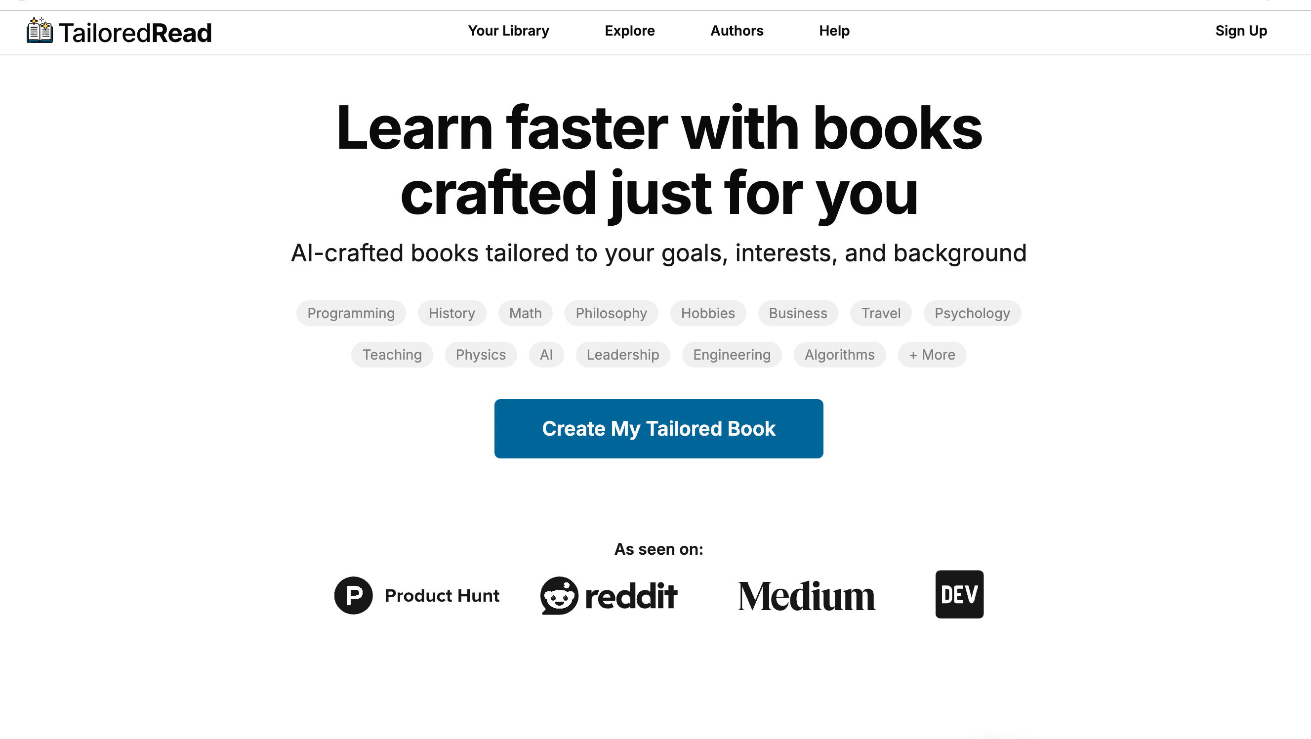 TailoredRead is an AI-powered service that creates personalized nonfiction books tailored to your specific goals, interests, and skill level. The platform uses AI to generate custom books on various topics, helping users learn any subject quickly and easily. It crafts books precisely tailored to individual goals, interests, and backgrounds, consolidating knowledge into a single focused book and saving learning time.
