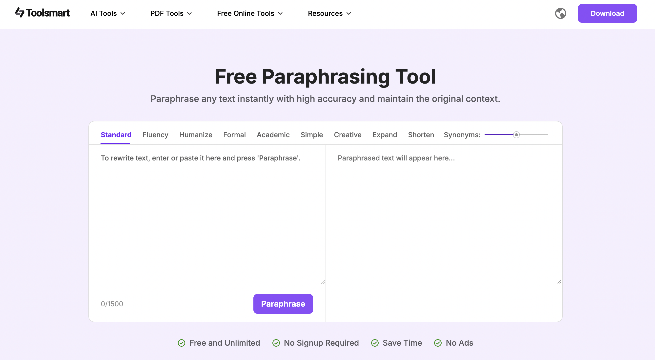 Simply paste your text into the provided text box, select one of the 9 paraphrasing modes (Standard, Fluency, Humanize, Formal, Academic, Simple, Creative, Expand, Shorten), and click the ‘Paraphrase Now’ button. The tool will then rewrite your text according to the selected mode.